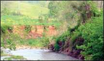 | The steep, eroded left bank of this stream contrasts with the vegetation-covered right bank. Photo courtesy Bev Hunter |