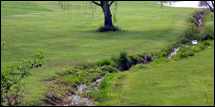 | WHAT TO AVOID: The mowed lawn to the edge of the stream allows rapid runoff during rainstorms and provides no cooling effect for the stream water. Sedimentation from this runoff flows into a nearby pond. Photo courtesy Bev Hunter |